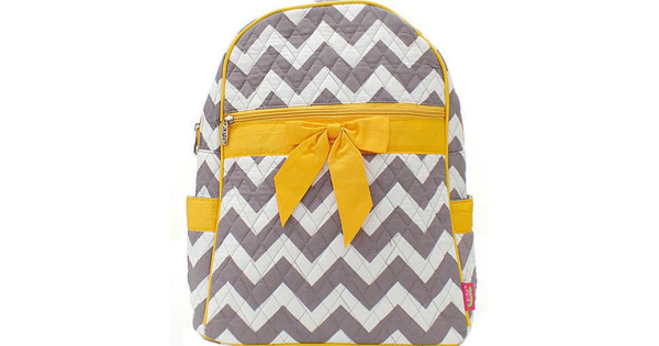 Chevron Backpack with Ribbon Accent Chevron Print Quilted Microfiber Chevron Backpack with Ribbon Accent Adjustable Straps. Zipper Closure. Front Zippered Pocket Two Side Pockets, Metal Feet On Bottom. Inside Pockets 12.0"" x 14.0"" x 5.5""